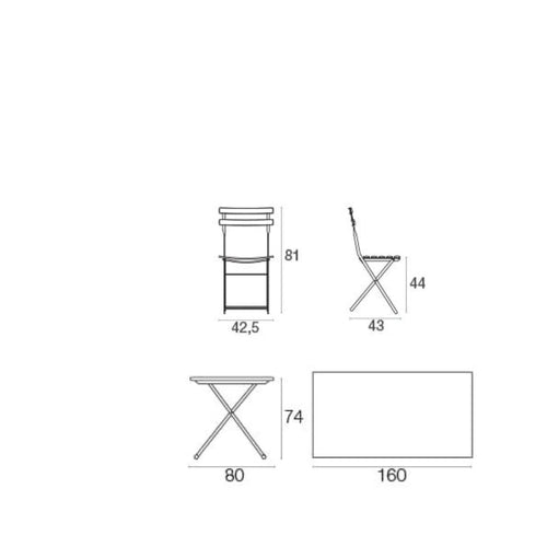 Set de 4 sillas y una mesa de 80cm x 160cm.